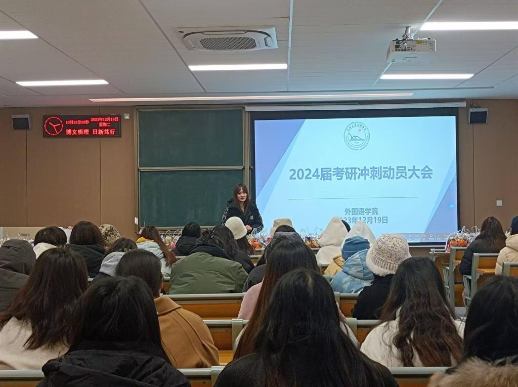 本网讯(通讯员 唐倩)12月19日上午十点,外国语学院在教学楼A-308召开了考研冲刺动员大会。此次活动由辅导员许静婷主持,外国语学院党总支书记王玲玲、2024届全体考研学生参加。