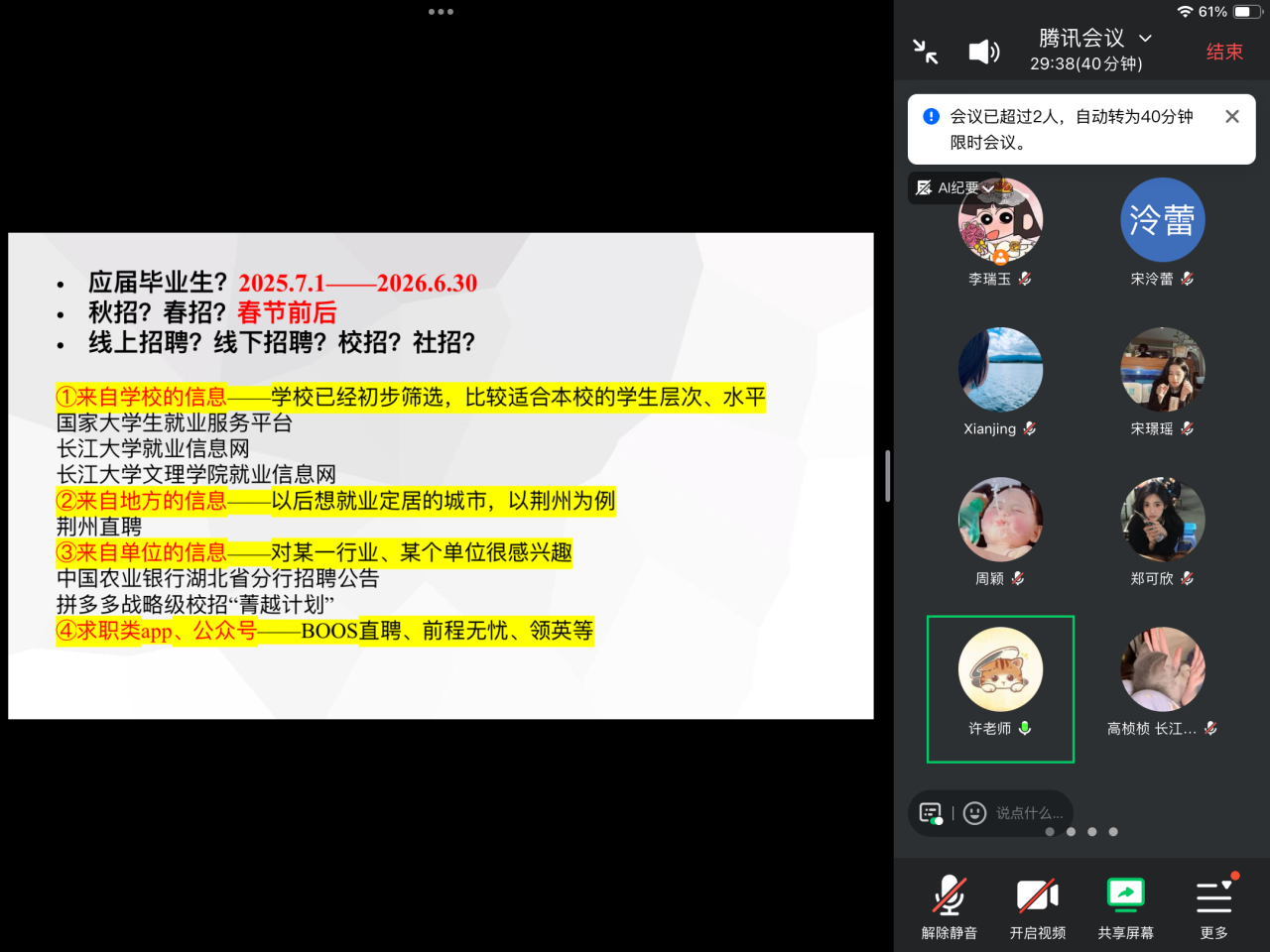 首先,辅导员许静婷详细说明了“2026届毕业生就业日历”,梳理了从职业探索、实习实践到秋招、国考、考研及春招等关键时间节点,帮助同学明确各阶段任务。同时,推荐了学校就业网、正规招聘平台、企业官网等可靠信息渠道,提醒学生注意甄别信息,防范收费诈骗、虚假招聘等陷阱。