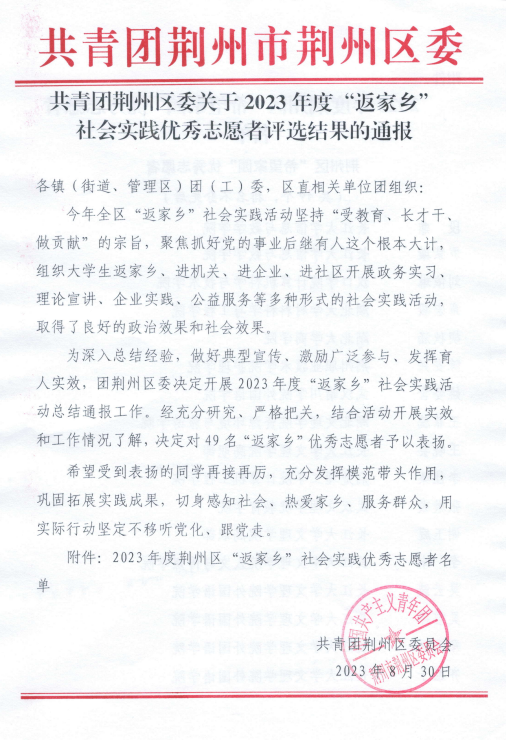 本次暑期三下乡活动充分展示了我院志愿者们有理想、敢担当、能吃苦、肯奋斗的精神面貌。今后我院将继续加强对荆州区共青团工作的支持,进一步发挥优秀志愿者模范带头作用巩固拓展实践成果,用实际行动坚定不移听党化、跟党走。