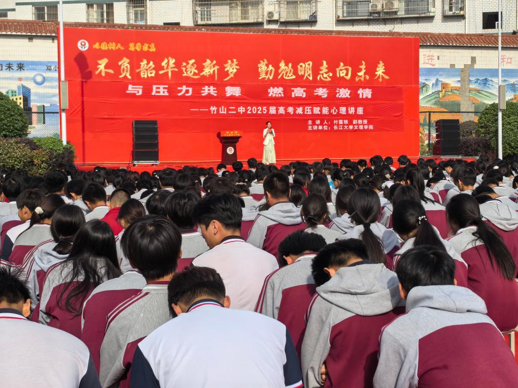 本网讯(通讯员 李培培)为帮助高三学子缓解备考压力,调整心态,2025年4月25日,外国语学院副教授、国家二级心理咨询师付霆轶受邀为十堰市竹山县第二中学,面向全体高三学生开展了一个小时四十分钟题为《与压力共舞 燃高考激情》的高考减压赋能心理讲座。相关校领导、高三年级负责人和全体班主任出席活动。