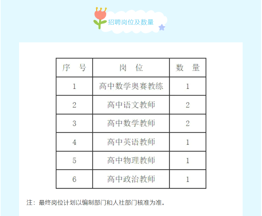 为了适应学校快速发展,储备优秀人才,现面向全国招聘优秀教师,具体条件如下: