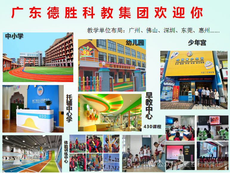 广东德胜科教集团,是从事科教投资的大型实业公司,以“科教兴国”为己任,以“教育报国”为宗旨。致力于中小学教育、游学拓展、师资培训、430课后服务、学历提升和技能培训六大板块的业务。以素质教师培训、科技教育投资为核心,有效地将政府、企业、高校与人才资源完美嫁接,帮助学生提升核心竞争力、为社会培养优秀人才。联盟投资单位有广东岭南青少年宫、阳光学校、岭南幼儿园、广东起飞教师人才中心、广州起飞教育、中小学家教平台、广州市立大教育、广州贝高托辅中心等,致力打造岭南知名科教产业综合服务商。