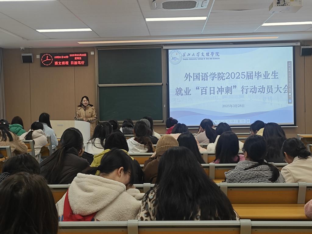 本网讯(通讯员 张会斯涵 钟燚)3月28日下午3点,外国语学院在A-104教室召开2025届毕业生就业“百日冲刺”行动动员大会。外国语学院党总支书记王玲玲、辅导员钟燚及2025届全体毕业生到场参加。本次会议由辅导员钟燚老师主持。