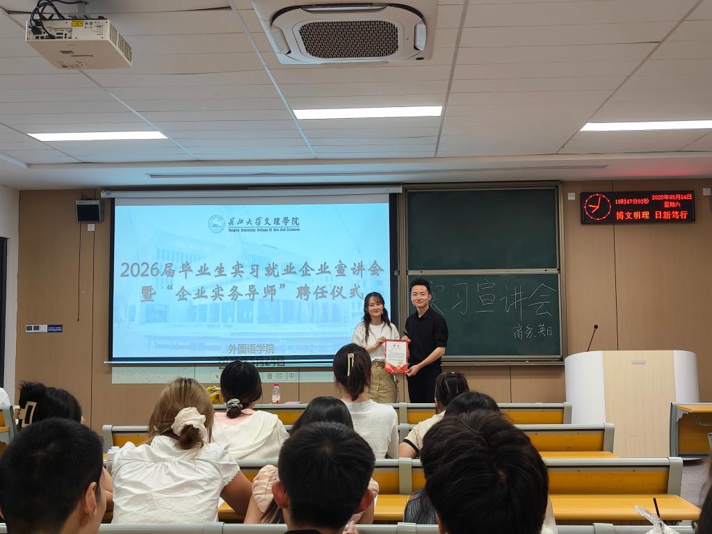 本网讯(通讯员 李瑞玉)5月24日下午外国语学院在教学楼C-119召开2026届毕业生实习就业企业宣讲会(商务方向)暨“企业实务导师”聘任仪式。外国语学院党总支书记王玲玲、毕业班辅导员许静婷,全体2026届毕业生(商务方向)到场参加。会议邀请义乌市知见企业管理咨询有限公司代表陈学威经理主讲。