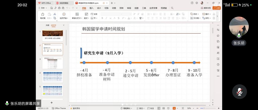张乐玥老师介绍了英韩双语专业的优势、韩国近些年对于吸引国外人才所采取的优惠政策。详细介绍了申请的准备工作和重要时间节点,分享择校经验及申请奖学金的技巧,为学生提供了更全面、更详实的出国留学指导和建议。