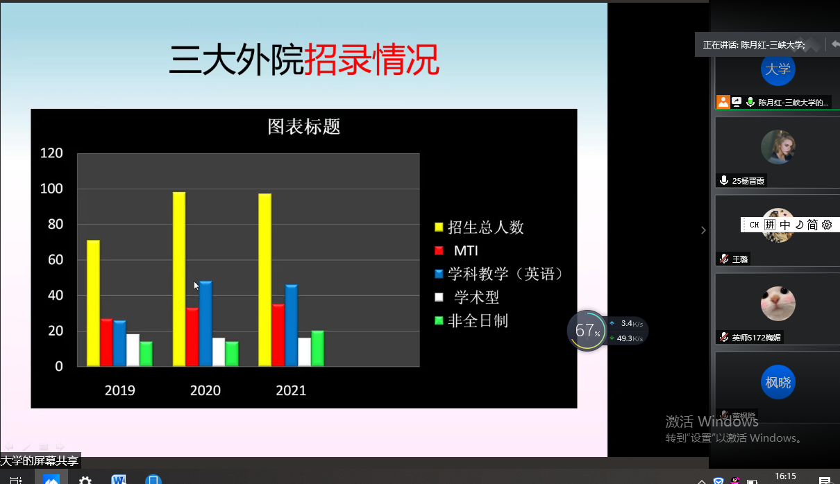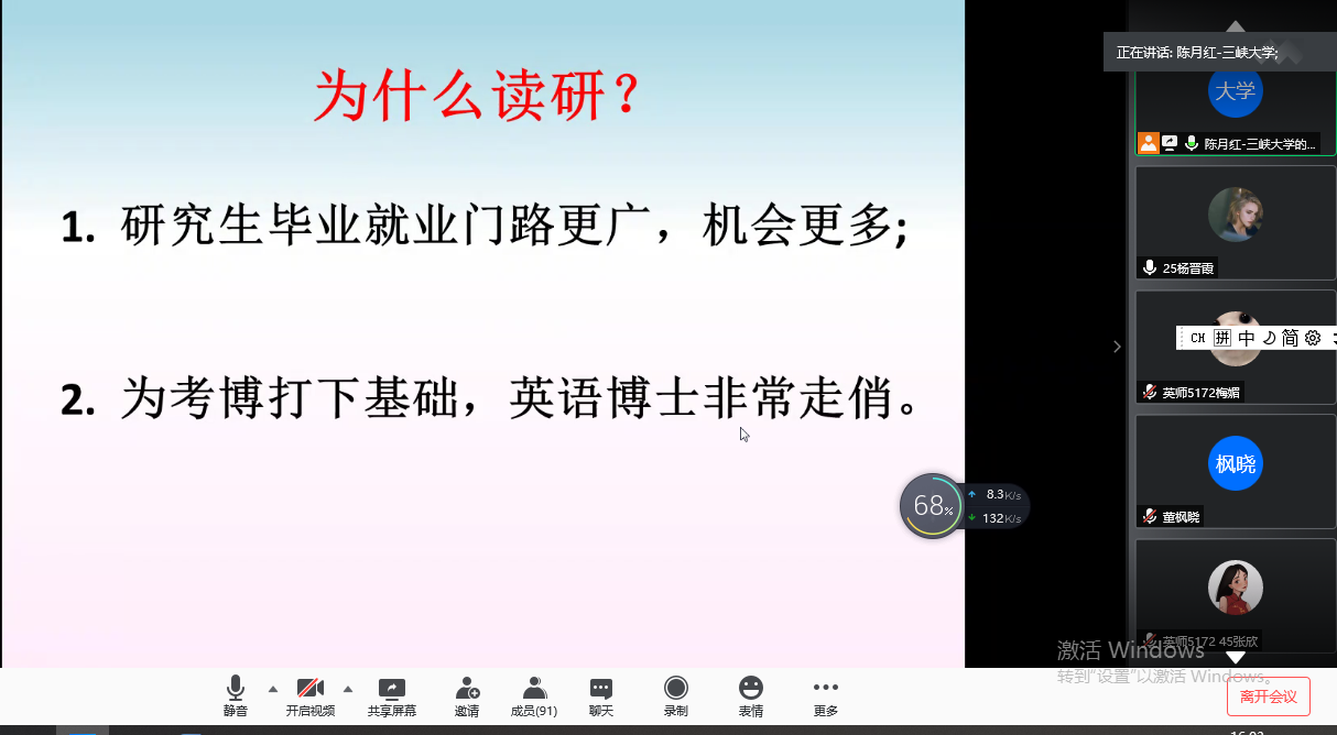 (通讯员 杨晋霞)为了给有意向的考研学子提供更多的备考经验,9月10日下午四点外国语学院组织举办了“2021届研究生选校及备考技巧”的专题讲座,本次讲座由外国语学院雷昕老师主持,三峡大学外国语学院副院长陈月红,16级成功上岸三峡大学学科英语专业的董枫晓学姐主讲,辅导员拓颖老师和2021届所有考研意向的同学参加此次讲座。