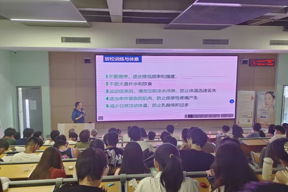 讲座伊始,皮肤科主任医师孙毅为大家带来主题为《青春的你还在为痘痘而烦恼吗?》的讲话。从痤疮、脱发、光老化和防晒方式三方面为我们讲解,提高了我们的预防意识。随后,医师张雯从定义、影响、临床类型、自我应对的一般疗法、引起的因素、辨别方法的等方面对足癣进行介绍。然后,康复科的骨科运动康复治疗师刘明辉主讲《如何防治大学生运动损伤》。医师传授给我们一些热身准备的技巧,以及锻炼器材的正确使用方法。让我们有意识的去避免损伤关节、韧带的行为。