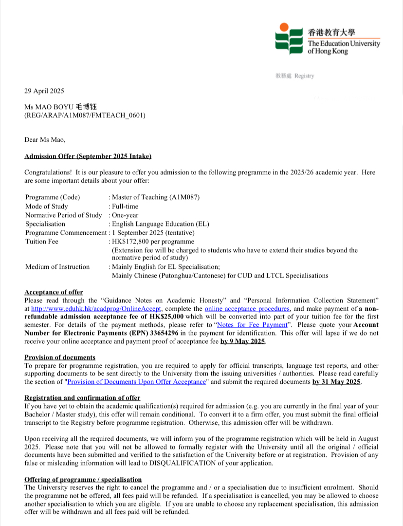 本网讯 在这个充满希望与活力的季节,williamhill官网外国语学院传来喜讯:该校2025届学生毛博钰凭借优异的综合素养,成功被香港教育大学“Master of Teaching”(教学硕士)专业录取,即将开启深造新征程。