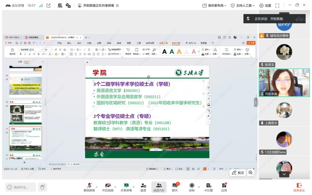 本网讯(通讯员 许静婷)为帮助考研学生明确备考方向、把握英语专业考研动态,2025年9月24日晚,我院特邀三峡大学外国语学院屈琼教授,为2026届考研学生开展了一场题为“研究生入学考试之策略分析:高效备考与心理调适”的专题讲座。讲座由外国语学院许晓艳院长主持,2026届毕业生辅导员许静婷、考研学子参加。