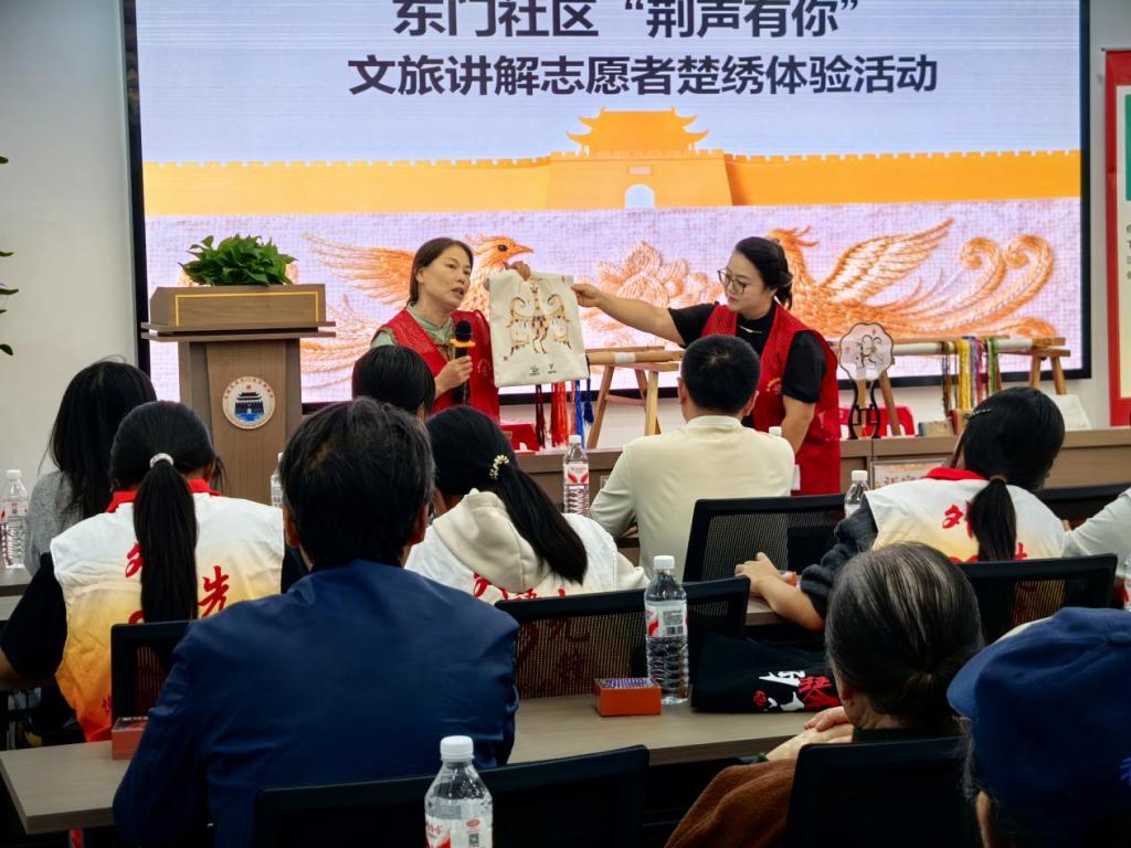 本网讯(通讯员 钟燚)当楚绣银针在指尖轻盈流转,荆州小胡鸭的醇厚香气在空气中悄然漫溢。2025年9月30日下午,荆州区东门社区二楼会议室里,一场融非遗雅韵与烟火温情于一体的“荆声有你”楚绣体验活动圆满举行。外国语学院“薪火助学”志愿服务队全程参与协办,与社区居民共同在指尖传承中触摸荆州文化的深厚底蕴。