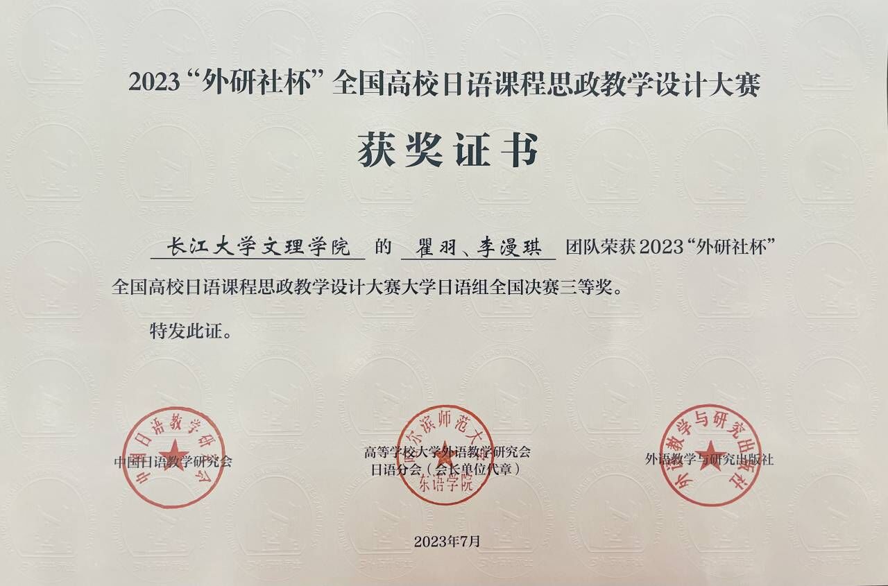 本网讯 7月28日,从外国语学院传来捷报:在刚刚落幕的2023年“外研社”全国高校日语学科课程思政教学设计大赛(大学日语组)中,该院教师瞿羽、李漫琪团队荣获本届大赛全国决赛三等奖。