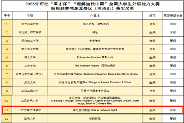 此次获奖作品紧扣“用英语讲好中国故事”核心,立足荆楚文化根基与时代发展视角,构建起特色鲜明的楚文化传播矩阵。在第八届“外教社杯”全国高校学生跨文化能力大赛“讲述中国传播中国”短视频大赛中,作品《漆语千年・楚韵流光》聚焦楚文化漆器魅力,获省级特等奖;2025“外研社•国才杯”“理解当代中国”全国大学生外语能力大赛短视频赛项中,作品《漆光里的荆楚》深挖漆器背后的文化内涵,摘得省级金奖;2025年“高教社杯”“用英语讲好中国故事”短视频大赛上,作品《数字荆州》则以现代视角展现城市活力,获省级二等奖。