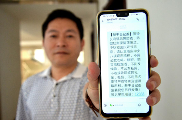 为加强节前廉洁教育,打好拒腐防变“预防针”,江西省新干县纪委监委向全县800余名党员领导干部发送中秋廉政短信,提醒党员干部严格遵守相关规定,廉洁过节。(江西省新干县纪委监委 刘洁 摄)