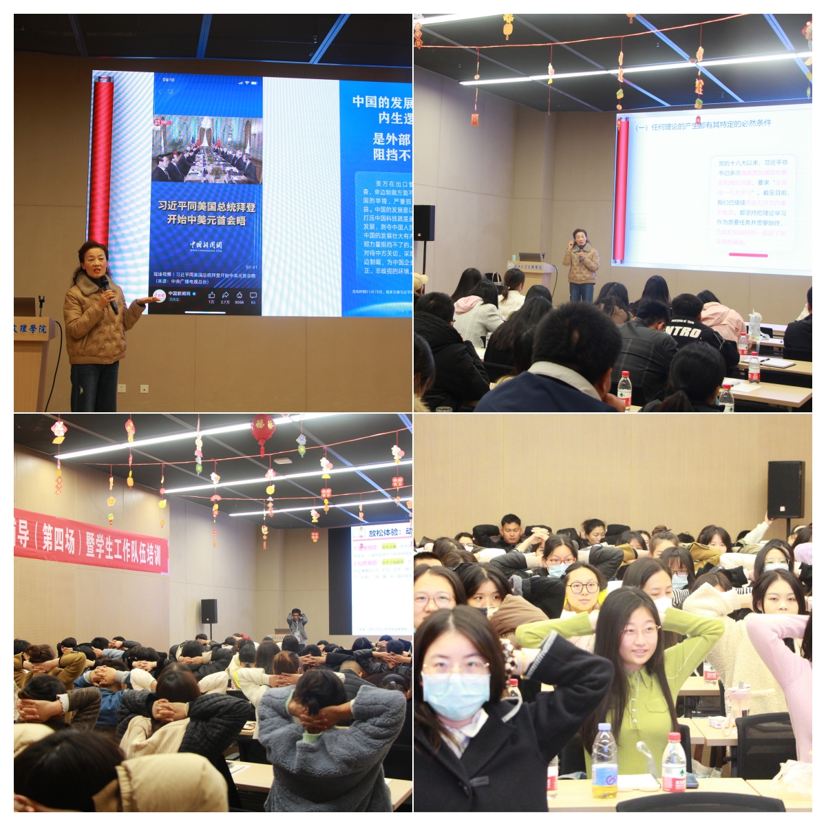 在“主题教育专题辅导”环节,长江大学学生心理健康教育中心专职教师曹国光为我们带来了《思想政治教育视域下学生工作者的自我心理培育》的讲座。曹老师围绕认知与行为疗法的工作原理,从情绪的识别和命名、认知重建技术、行为改变技术三个层面展开讲解,帮助学生工作者正确识别情绪,合理疏导情绪;长江大学马克思主义学院教授贾廷秀做了题为《坚持不懈用习近平新时代中国特色社会主义思想凝心铸魂》的专题讲座。贾教授从世情、国情、党情、社情四大方面展开,从理论和实践向我们阐述了党员的责任,强调了学生工作者在人才培养上的责任和义务。