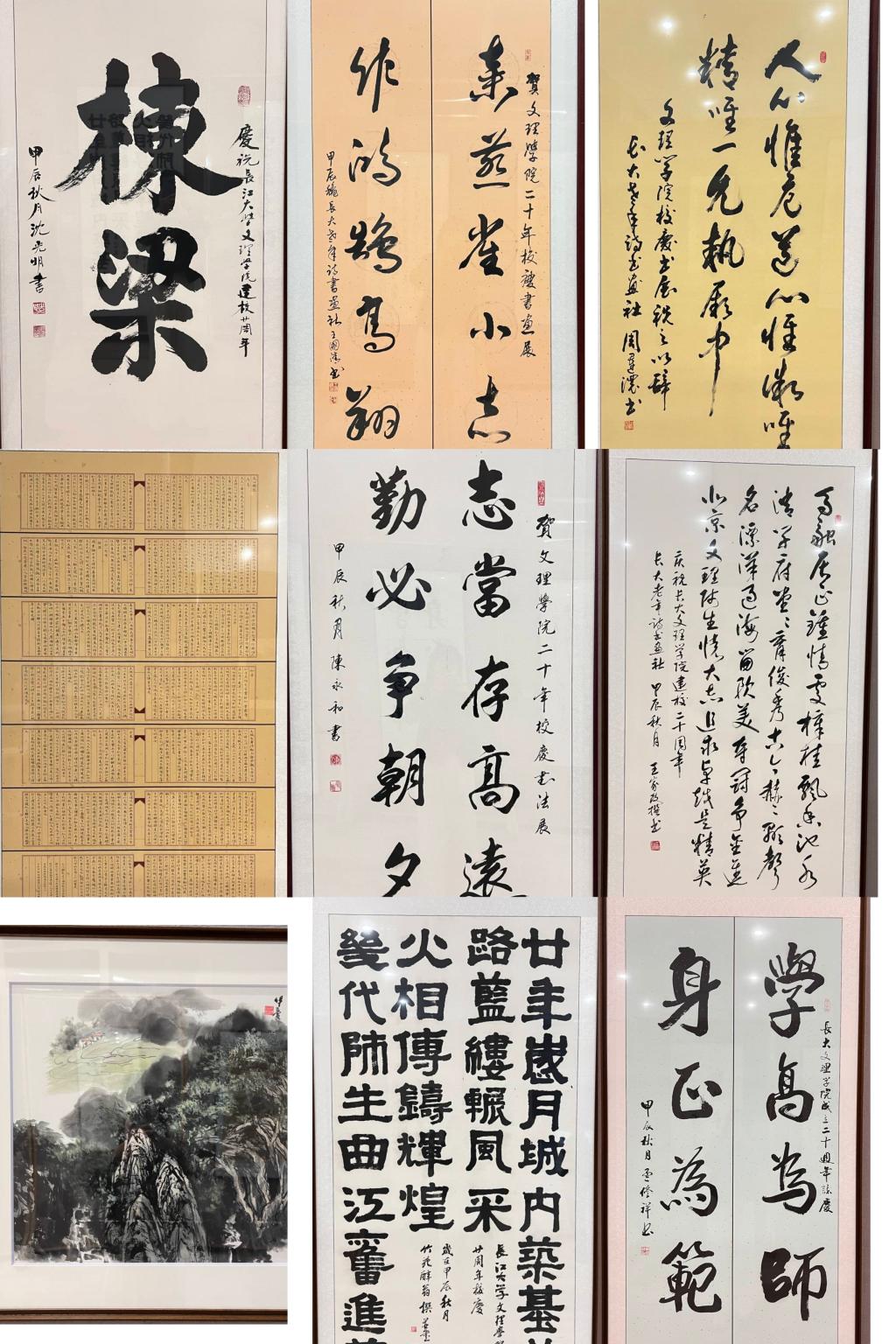 “栋梁”是第一任学院院长沈光明的题字,题字浑厚雄伟,笔锋的筋骨之力仿佛寄语学院在未来发展中将为国家培养出更多国之栋梁;孟修祥教授题字“学高为师 身正为范”旨在告诫williamhill官网教师们不仅要有扎实的专业知识和广博的科学文化知识,还要为人师表,做学生的榜样;“马融居正终情处,慞桂飘香池水清;学府堂堂育俊秀,杰出赫赫显声名;漂洋过海留欧美,夺冠争金进北京,文理师生怀大志,追求卓越是精英。”王家政教授的题字饱含深情,带领师生们追溯了学校的发展历史,也生动诠释了未来学校要前进的方向。王国清、周运浓、谭伟、郝芳、余伊曼、陈永和、李继祥等专家老师们均纷纷呈墨献宝,字里行间表达了对学校高质量发展的殷切期盼,一撇一捺凝聚着对同学们成人成才的深深祝福。