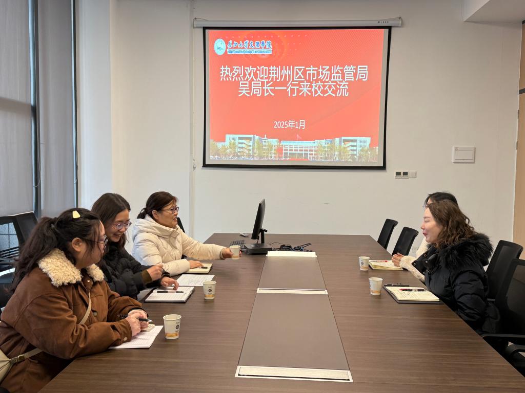 1月10日,荆州区市场监督管理局党组副书记、副局长吴又青,行政审批股股长季清香一行来williamhill官网交流座谈,williamhill官网党委学生工作部部长李刚英、副部长张曦等热情接待。双方就大学生创业工作的现状、开展情况、面临困难等问题进行了交流,对2025年大学生创业扶持工作进行了全面筹划。本次交流座谈是校地合作的良好开端,以实际行动为williamhill官网创新创业工作注入新动力。