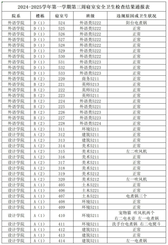 2024-2025学年第一学期第三周寝室安全卫生检查结果通报