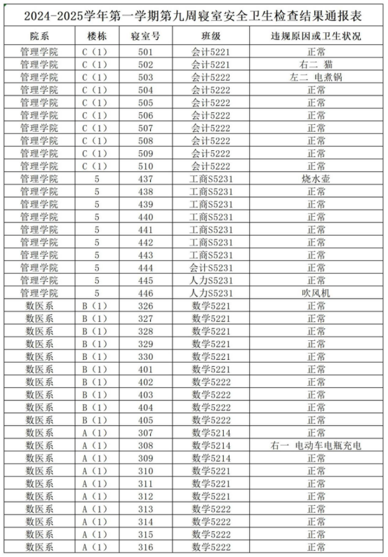 2024-2025学年第一学期第九周寝室安全卫生检查结果通报