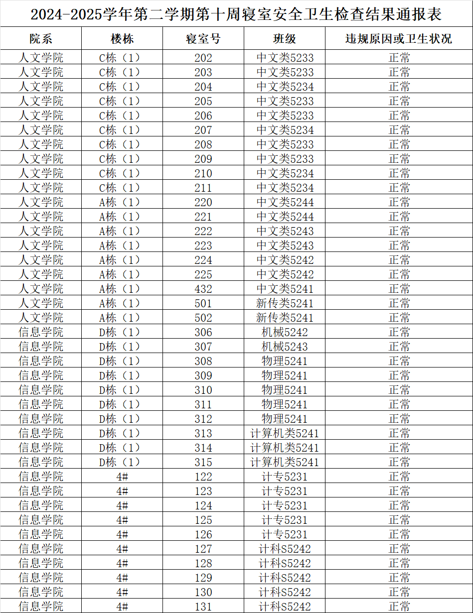 2024-2025学年第二学期第十周寝室安全卫生检查结果通报表