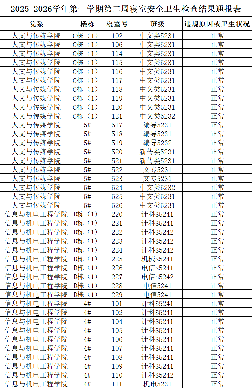 下一条:2025-2026学年第一学期第一周寝室安全卫生检查结果通报表