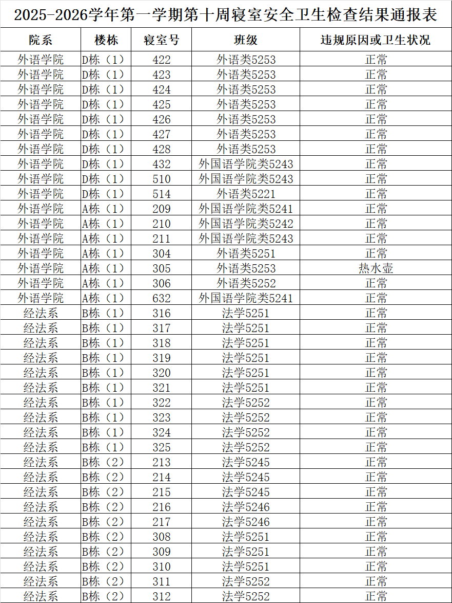 2025-2026学年第一学期第十周寝室安全卫生检查结果通报表