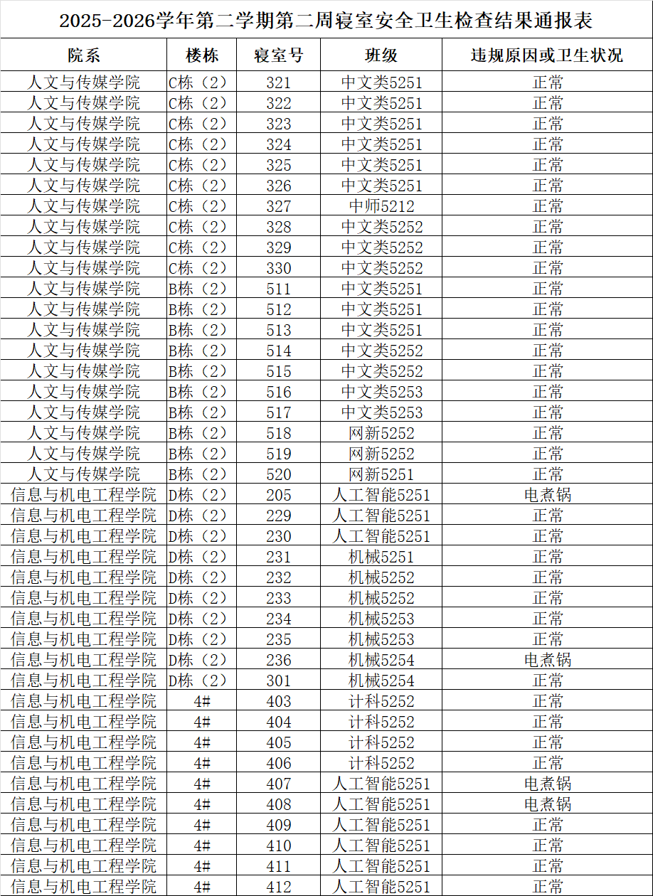 2025-2026学年第二学期第二周寝室安全卫生检查结果通报表