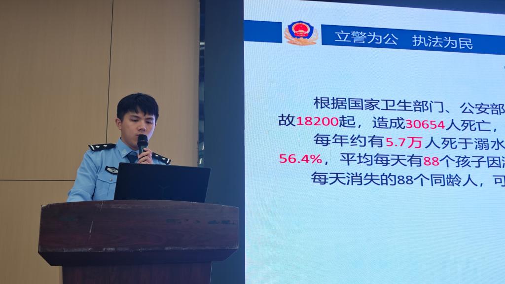本次讲座的“重头戏”由被誉为“江河卫士”的长江航运公安局荆州分局荆州派出所民警团队倾情呈现。苏毅哲警长首先带领大家直击“溺水真相”,他用清晰的逻辑链条,层层剖析了溺水事故的高发场景与常见诱因,甚至生动描绘了溺水发生时身体的细微变化,将抽象的风险转化为可知可感的科学认知。紧接着,一幕幕发生在本地的真实案例被搬上讲台,苏警长以案为鉴,深刻揭示了每起悲剧背后的疏忽与教训,犹如一记记警钟,在师生心中久久回荡。结合荆州河网密布、沟渠众多的特点,他还化身“安全导航”,清晰标注出身边隐藏的危险水域,再三叮嘱师生对未知水域保持敬畏,切勿让侥幸心理酿成憾事。