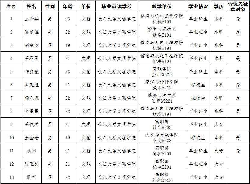 通过荆州区武装部组织的体检、政审考核、心理测试、役前训练等环节,我院王泽兵等13名同学经湖北省荆州市荆州区人民政府征兵办公室批准光荣入伍,现根据相关规定予以公示,公示时间为2023年3月13日至3月17日。如有异议,请在公示期内向学院纪检监察部或荆州区武装部进行反映。