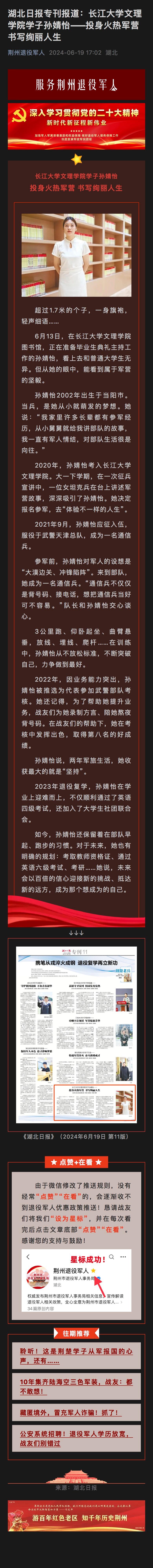 湖北日报专刊报道:williamhill官网学子孙婧怡——投身火热军营 书写绚丽人生