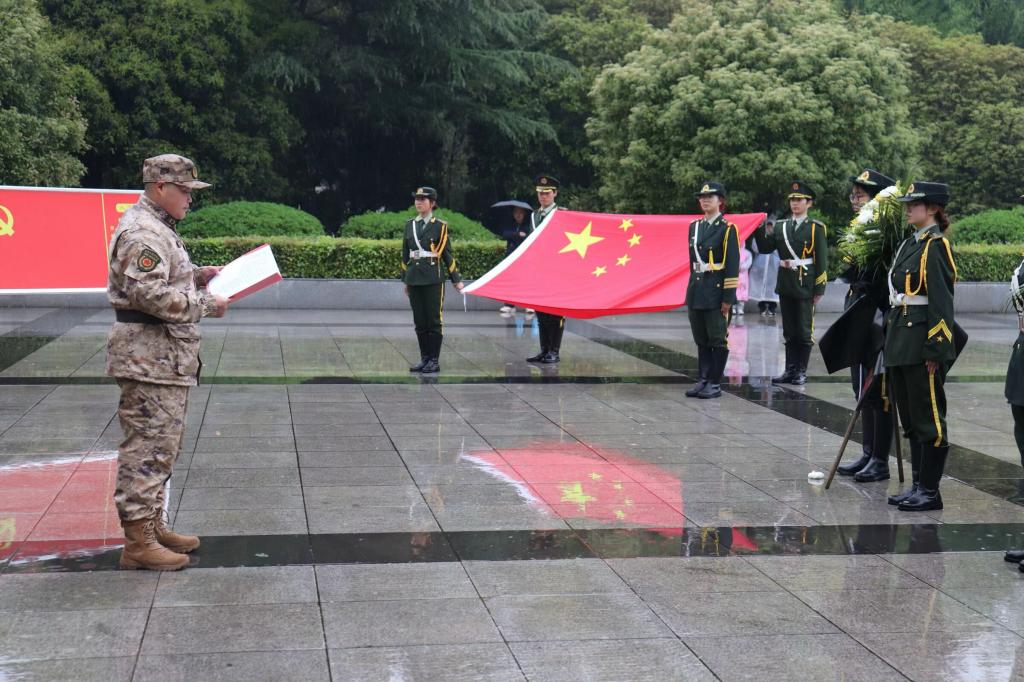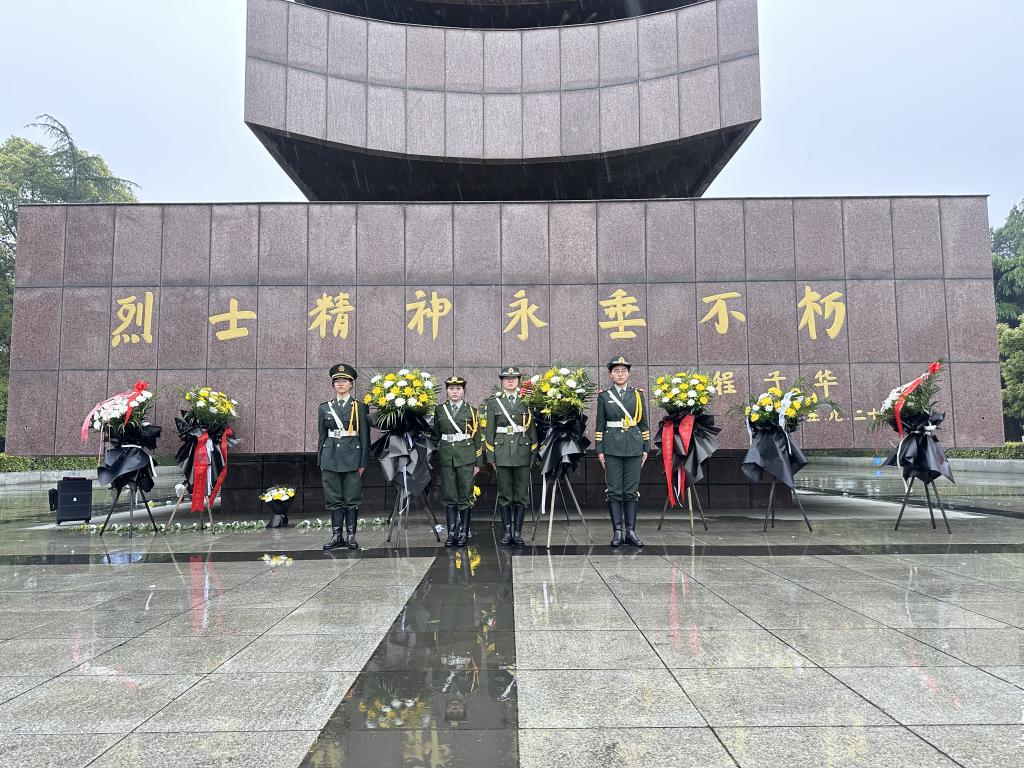 在庄严的献花曲中,老兵团和国旗护卫队代表来到烈士墓碑前,献上手中的鲜花,寄托哀思,感受革命精神。