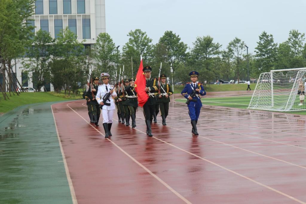 在细雨中,国旗护卫队昂首阔步,动作整齐划一,随着国歌的奏起,五星红旗缓缓上升,迎风飘扬。接着,学生代表范怡然、朱颖在国旗下朗诵《百年芳华》,其中提到的“红船精神〞和“长征精神”贯穿了中国共产党百年奋斗历程,也是我们党的强大精神力量和宝贵精神财富。当代青年不仅要勇于担当使命,更要彰显为国为民的情怀,要敢于无畏前行,善于开拓创新,以科技报国的责任和担当各展所长,在国家发展历程中实现人生理想。