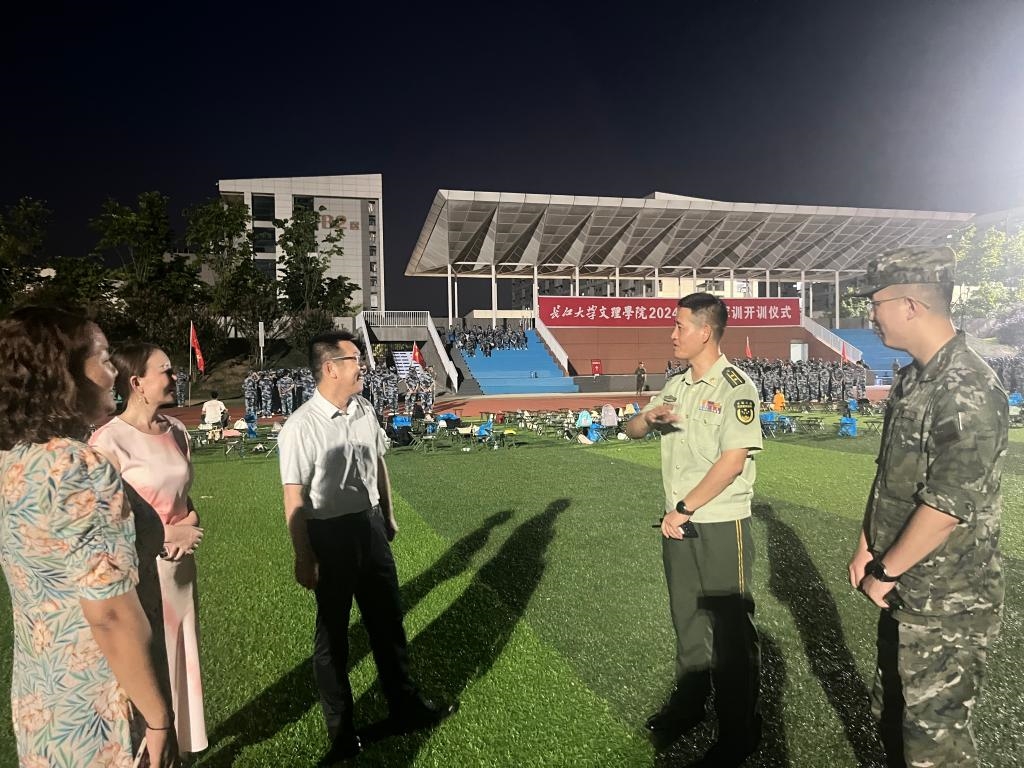9月9日晚19时,学校领导学院党委书记颜建洲在军训团团长武警支队副支队长张坤、党委学生工作部部长李刚英的陪同下,深入军训现场检查指导新生首日军训工作,并慰问参训的教官及师生。