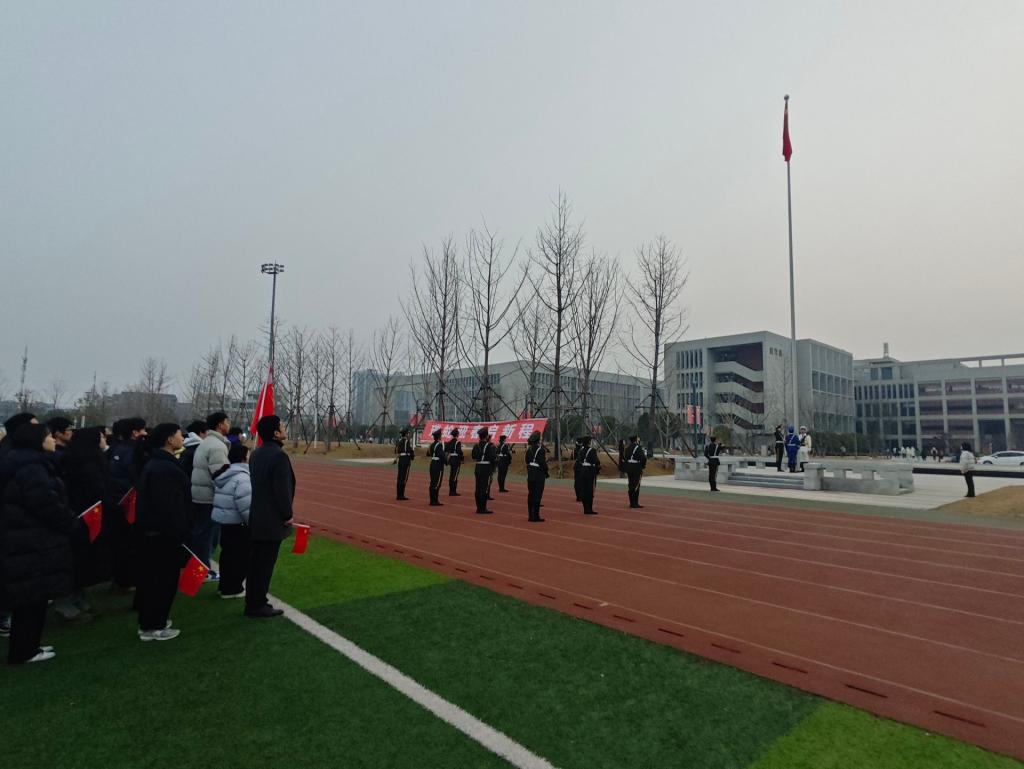 在《义勇军进行曲》激昂旋律中,全体师生肃立行注目礼,五星红旗于晨光中冉冉升起。