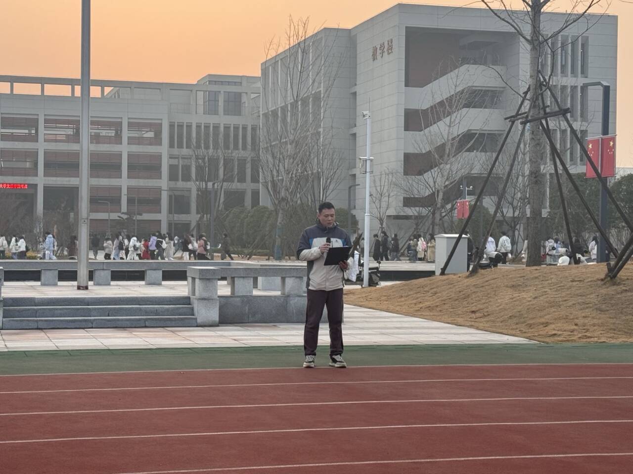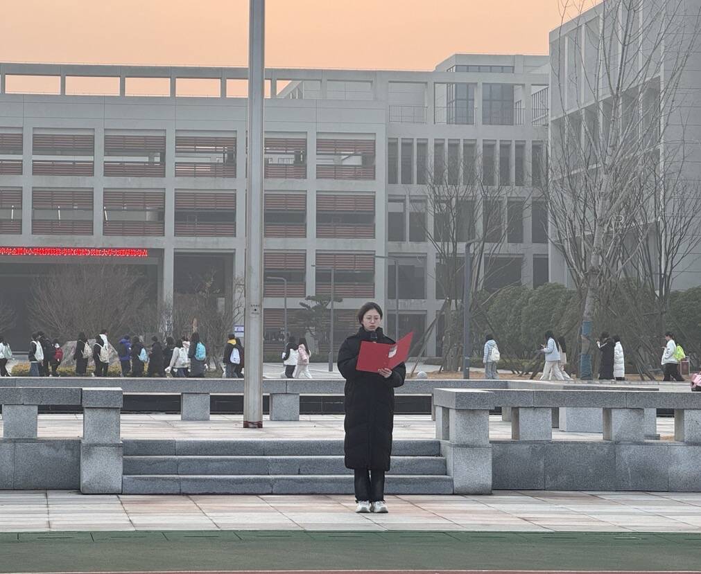 清晨,校园内阳光明媚,体育系全体师生齐聚操场,怀着崇敬与期待的心情,等待着升旗仪式的开始。随着一声清脆的哨音,国旗护卫队迈着整齐而坚定的步伐,护卫着鲜艳的五星红旗走向升旗台。在庄严的国歌声中,五星红旗冉冉升起,全体师生庄严肃立,行注目礼,共同感受着国旗升起的神圣与庄严,心中涌动着对祖国的热爱与敬意。