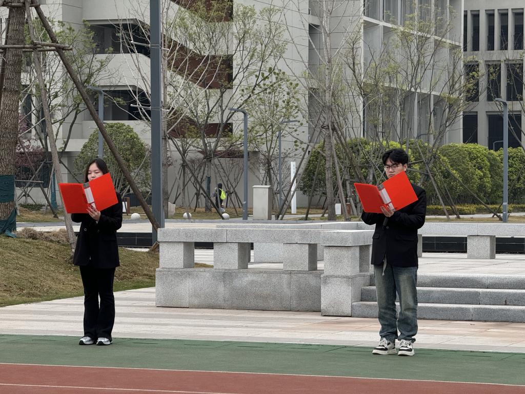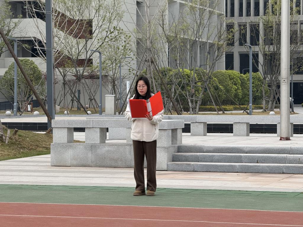 升旗仪式上,“红色话筒”辅导员工作室负责人李艺欣老师以革命先烈事迹为引,强调当铭记历史,以先烈为榜样,勇担时代使命。随后,优秀学生代表朗诵诗篇《山河念,英魂祭》,以深沉语调再现先烈浴血奋战的壮烈场景,感受先烈们的爱国情怀,现场氛围庄严肃穆。