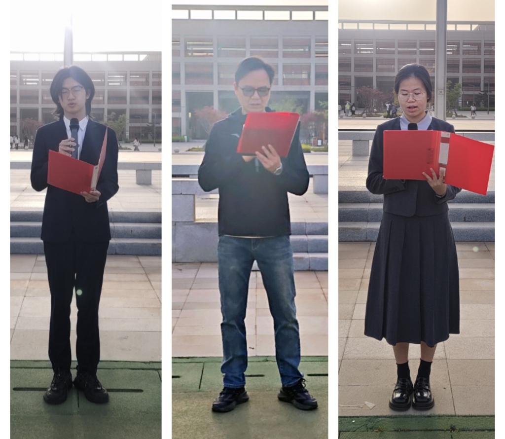 早上6点50,升旗仪式正式开始。英姿飒爽的国旗护卫队迈着铿锵有力的步伐护送国旗入场。伴随着雄壮的《义勇军进行曲》,鲜艳的五星红旗冉冉升起,全体师生肃立注目,齐唱国歌,表达对祖国的崇高敬意。仪式上,教师代表陈勇老师发言,他沉稳有力的声音回荡在操场上,鼓励同学们在学习中精益求精,他勉励同学们树立家国情怀,以扎实学识服务国家战略需求,做有理想、敢担当、能吃苦、肯奋斗的新时代大学生。接下来,学生代表数学5231班周忆景呼吁同学们紧握民族复兴接力棒,担时代重任,铭记历史,居安思危,以实际行动践行“强国有我”的青春誓言。最后数学5244班周震宇号召同学们增强保密意识、树立正确价值观、努力学习,从自身和小事做起,为维护国家安全贡献力量,共同筑牢防线。