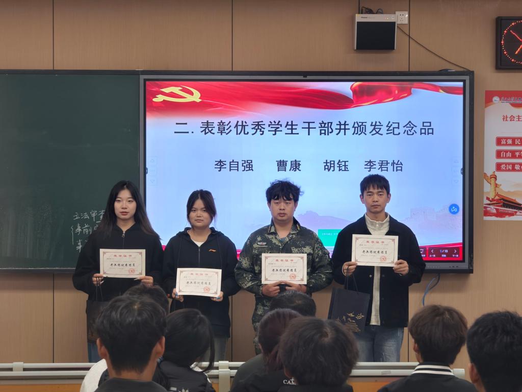 全体起立,奏唱国歌。随后大会开始,对李自强、曹康等优秀学生干部进行表彰,为其颁发纪念品。他们在过去的一年中恪尽职守,在组织建设等方面作出了突出贡献。