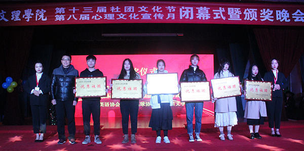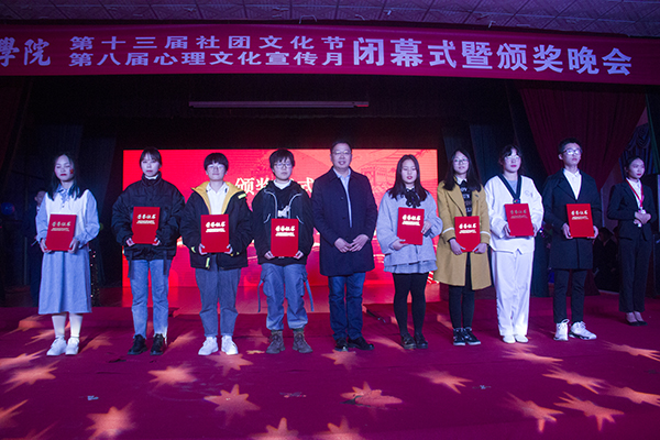 王文凯、朱继平、尹家经、康建虎、李琴、黄华依次上台为2018-2019学年三好学生、优秀学生干部、优秀班级体,以及在第十三届社团文化节、第八届心理文化宣传月中涌现出的优秀社团、优秀组织单位颁奖。