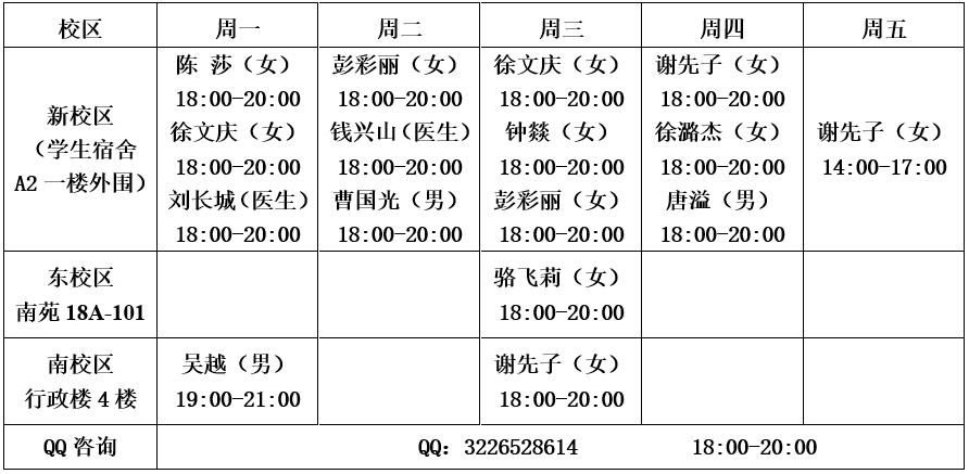 3.为了便于咨询工作的有序开展,请通过咨询QQ至少提前一天预约,如有事无法前来,请至少提前半天取消预约,迟到15分钟视为取消。
