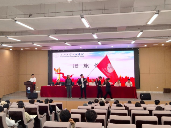 会议第三项议程,由党委学生工作部副部长王琳向第一届大学生自律委员会主席团代表授旗。