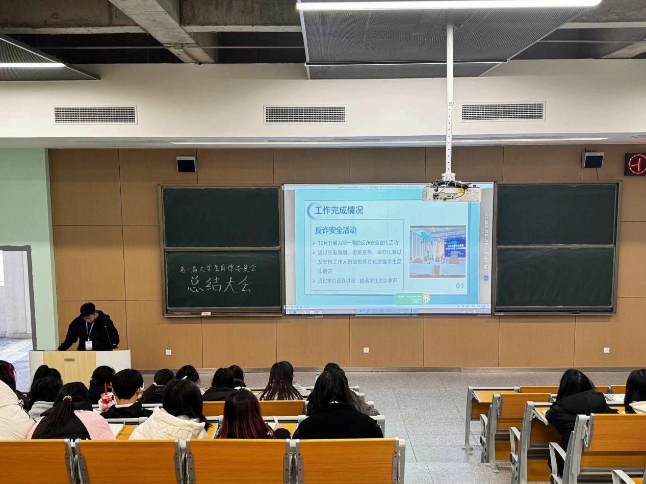 会上,大学生自律委员会各部门代表依次上台,通过图文并茂的PPT展示,详细汇报了本部门在过去一学期中组织的各项活动、完成的工作任务以及工作经验总结分析。从日常的三率考勤到抓拍校园不文明现象,从“筑牢安全防线,共筑反诈长城”到“火焰蓝,安全梦”等等,大学生自律委员会各部门在不同领域都发挥了重要作用,为丰富校园生活、营造良好校园氛围做出了积极贡献。