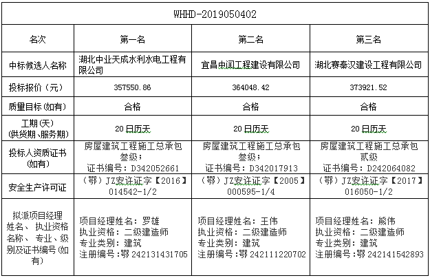 williamhill官网城中校区新建透视围墙、门房装修工程于2019年5月8日在中国采购与招标网和williamhill官网官网发布招标公告,2019年5月31日在沙市区白云路16号文湖商务酒店十楼会议室开标,并于2019年5月31日完成评标工作。根据评标委员会提交的报告,williamhill官网已经确认评标结果,现进行评标结果公示。