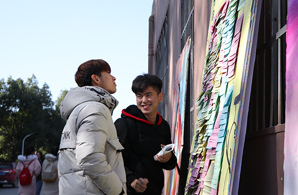 展出过程中,每位创作者对作品的内涵进行现场阐述,由应用心理学专业高年级师生代表从创作心理视角解读作品内容,并现场拆启装有心理健康问题的留言信封,逐一进行答疑后,将回复字条张贴到解忧锦囊文字展板上。当天,在户外展区,心理学专业师生现场答疑四百余条,向师生传达了心理健康理念与基础知识。