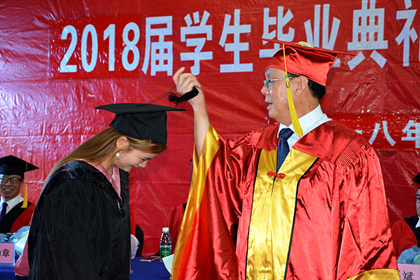 在庄严隆重的气氛中,梅平为毕业生授予学士学位并为他们拨穗正冠。