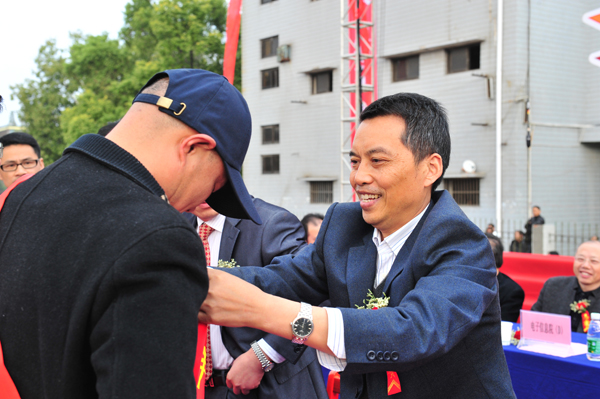 朱业宏为获得“工作十年奉献奖”的教职工佩戴绶带