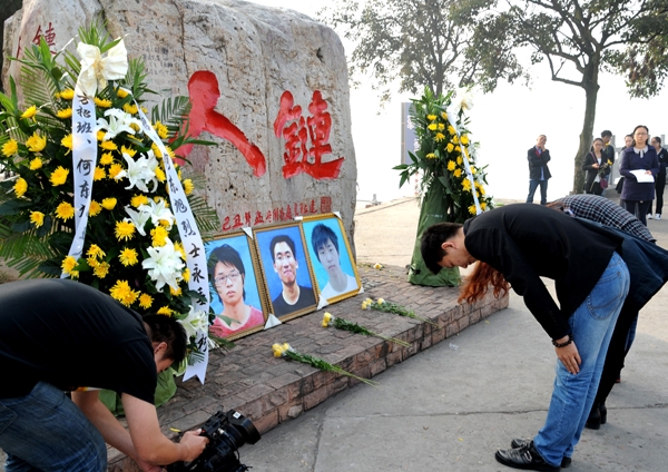 学生代表、广电5141班徐棕莉在秋风中发言,“2009年10月24日,这一天,你们的纵身一跃,划出了一条壮丽的弧线;你们的奋力一举,绽现了一束生命的光芒。青春在你们身上刚刚起了个头,就定格成永久的祭奠。”“死者长已邑,生者当勉励。我们可能永远不能成就像你们那样的高度和广度,但是,在向你们学习的道路上,在践行社会主义核心价值观的征途中,在为实现‘中国梦’的旅程里,我们可以做得更持久,更努力,以此来完成你们未尽的理想。如果你们可以感知,请从远方注视我们,给我们力量,伴我们前行。”