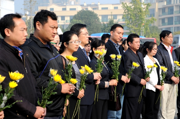 上午9时,在“人链”纪念碑前,全体师生默哀三分钟。英雄大学生代表姜梦淋、李立科、徐彬程手持黄菊,低头默哀,怀念曾经一同学习、生活过的好伙伴。