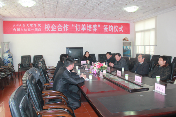 本网讯(通讯员 赵磊)1月17日,我院与台州市林家一酒店举行校企合作订单式人才培养项目签约仪式。学院院长沈光明、常务副院长王金琼、副院长郭睦庚及相关职能部门负责人和管理学部负责同志参加了签约仪式。