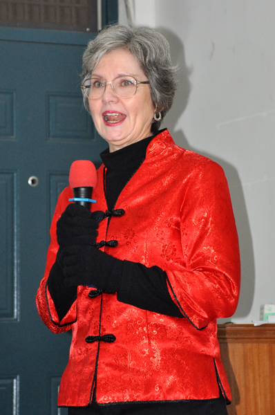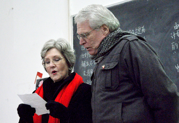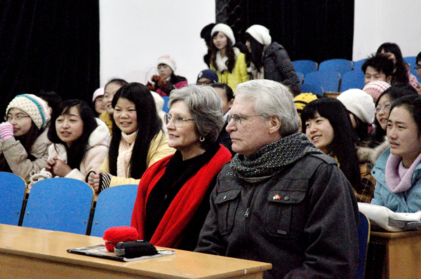 猜词游戏环节结束后,女外教Terry用纯正的美式英语为同学们深情朗诵了《圣经》中的哲理诗《知足》,用诗歌中蕴含的丰富人生哲理为同学们开启心灵之门,洞开智慧之窗。Terry还回忆了在文理学院任教期间与同学们共度的欢乐时光,坐在前排的几位女同学不禁潸然落泪,男外教Gary也站起身和同学们一起鼓掌致谢。