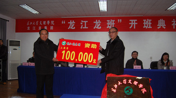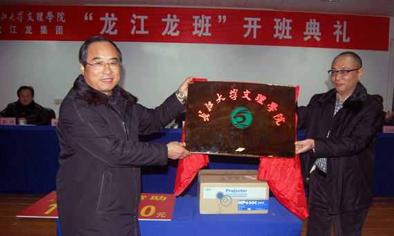 院长沈光明与龙江龙集团董事长朱利军共同为“龙江龙班”成立揭牌,朱利军董事长向学院捐赠助学金10万元。